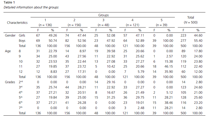 The non-probabilistic convenient sample included 500 children (girls = 223, boys = 277) aged 8 to 12 years old (M = 9.86; SD = 1.28), from the Metropolitan Region of São Paulo (MRSP) and the Metropolitan Region of Campinas (MRC). The participants attended the 2nd (n = 14), 3rd(n = 123), 4th (n = 105), 5th (n = 128), 6th (n = 116), and 7th grades (n = 14) of elementary school. Based on the participants’ answer sheets, 5 different groups were identified:
