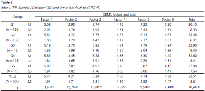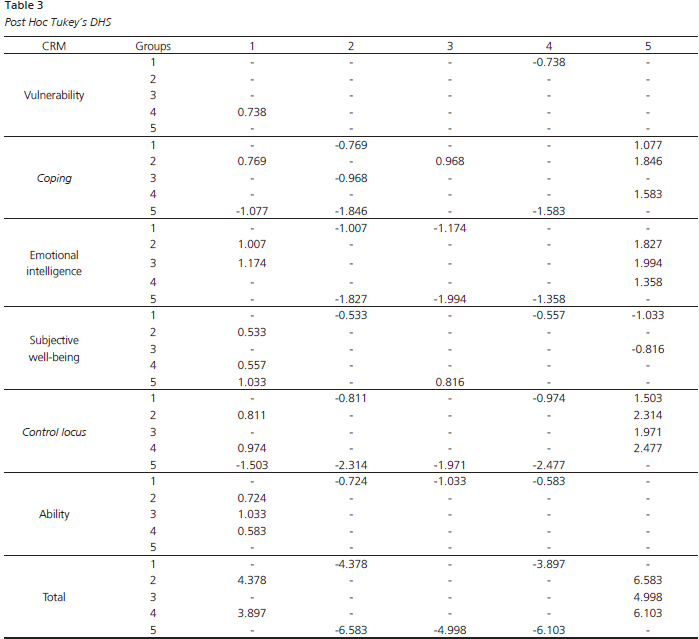 The first round of analyses involved the mean and standard deviation for the five groups, considering the six CRM factors and its grand total. Information is presented in Table 2. The results indicated that G1 participants had the lower means compared to other groups for the factors 4 – Subjective well-being and 6 – Ability. Likewise, G5 participants also had the lower means for the factors 1 – Vulnerability, 2 – Coping, 3 – Emotional Intelligence, and 5 – Control locus, as well as for the CRM’s grand total. Otherwise, higher means were found for: G2, factor 2 – Coping and for the CRM’s grand total; G3, factors 3 – Emotional Intelligence and 6 – Ability; G4, factors 1 – Vulnerability and 5 – Control locus; and G5, factor 5 – Subjective well-being.