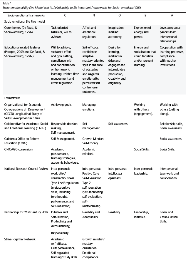 Recent developments in the fields of education, economics, psychology, and neuroscience have emphasized that Social-Emotional skills (SE) are as important as cognitive measures in predicting not only learning but various important life outcomes (Organization for Economic Cooperation and Development [OECD], 2016). SE are also frequently referred to as 21st Century Skills, personal characteristics that are considered crucial for individual’s life and work adaptation (Trilling & Fadel, 2009; Battelle for Kids, 2015). The topic of socio emotional skills has become increasingly important for education and policy makers. Several frameworks have proposed definitions, measures, interventions and applications in educational systems. Table 1 lists seven important frameworks that define constructs and measures for SE (lines 6 to 10): Organization for Economic Co-operation and Development (OECD, 2016), Collaborative for Academic, Social and Emotional Learning (2012), California Office to Reform Education (CORE, 2014), CHICAGO consortium (Farrington et al., 2012), National Research Council (2012), Partnership for 21st Century Skills, and Strive Task Force on Measuring Social and Emotional Learning (2013).