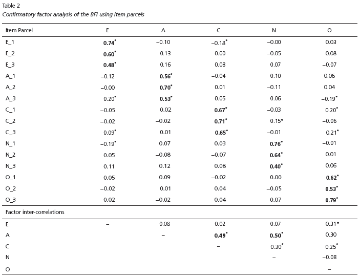In a first step, we tested the hypothesized five-factor structure of the BFI using HIC item parcels. Items were summed on the basis of their inter-correlations and observed internal consistency, so that each Big Five factor had three parcels as indicators. We fitted two models to the data, a fully constrained and an unconstrained model. In the constrained version, HICs were specified to load only on their hypothesized factor (no cross-loadings allowed). This model was tested via CFA. In the unconstrained version, items were free to load on each one of the hypothesized five factors. This less prohibitive model was tested via Exploratory Structural Equation Modeling (ESEM). Given the non-normal distribution of indicator variables as revealed by an exploratory analysis of data, in all analyses we employed a robust estimator for correcting the qui-square test value, namely Maximum Likelihood Robust.