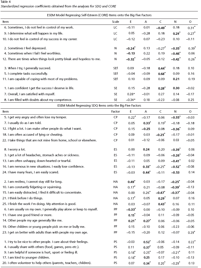 Results revealed a good approximate fit to the data for the model including items measuring self-efficacy, c2 (280) = 319.77, p = 0.051, RMSEA = 0.009, CFI = 0.994, TLI = .983, self-evaluation (CORE), c2 (160) = 263.27, p < 0.001, RMSEA = 0.023, CFI = 0.971, TLI = 0.937, and strengths and difficulties (SDQ), c2 (290) = 440.02, p < 0.001, RMSEA = 0.017, CFI = 0.974, TLI = 0.930. Table 4 shows detailed tables with standardized regression coefficients obtained from the analyses for SDQ and CORE tests that are the most factorially complex ones.