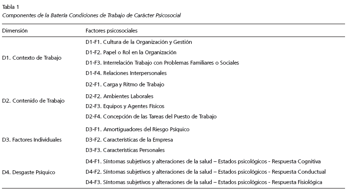 Batería para el estudio de las Condiciones de Trabajo de Carácter Psicosocial (CTCPS-MAC), desarrollada y validada por Carrión (2014a) en población española y posteriormente validada en población latinoamericana (Colombia, Ecuador, México, Perú y Venezuela) por un grupo de expertos. Fue diseñada para evaluar la percepción que tiene la población trabajadora sobre los factores psicosociales laborales en su propio entorno de trabajo, así como factores individuales, síntomas subjetivos y alteraciones de la salud. Posee una consistencia interna con el alfa de Cronbach de 0.92. La batería consta de 75 ítems que agrupan cuatro dimensiones como factores psicosociales globales y 14 factores psicosociales específicos integrados en las cuatro dimensiones (Tabla 1).