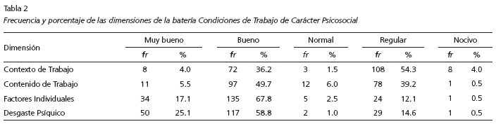 Los resultados obtenidos en porcentaje por dimensión psicosocial de la batería CTCPS-MAC se muestran en la Tabla 2, donde se observa el predominio de la percepción de los trabajadores en nivel de muy bueno y bueno para la dimensión Factores Individuales, mientras que para la de Contenido de Trabajo fue de poco más de la mitad de los participantes y para Contexto de Trabajo apenas de 40.2%, dando como diferencia, una alta percepción de normal, regular y nocivo, lo cual exige establecer medidas para mejorar esas calificaciones. No obstante, lo observado en las dimensiones referidas como variables independientes, el Desgaste Psíquico, considerado como variable dependiente, resultó con una alta incidencia de respuesta en muy bueno y bueno similar a la de los Factores Individuales.