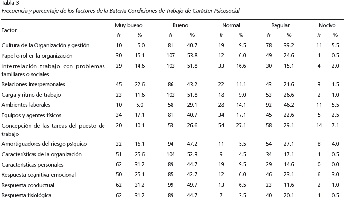 En esta investigación la percepción de los factores psicosociales fue más desfavorable en dos de las cuatro dimensiones que evalúa la Batería CTCPS-MAC en Contexto de Trabajo, particularmente en Cultura de la Organización y Gestión, y Contenido de Trabajo. Estos resultados se apartaron de lo encontrado en el estudio de Carrión et al. (2014b) en Colombia, ya que dichas dimensiones fueron las más favorables (considerando los niveles muy bueno y bueno) en un 85.2% y 78.1% respectivamente, mientras que las más desfavorables fueron Factores Individuales y Desgaste Psíquico con el menor porcentaje en los niveles normal, regular y nocivo.