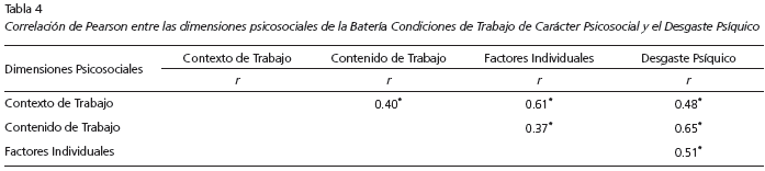 Se llevó a cabo una correlación de Pearson para ver la asociación de las dimensiones psicosociales con el desgaste psíquico. Los resultados indicaron una correlación media, positiva y significativa (Coolican, 2005) de las dimensiones contexto de trabajo, contenido de trabajo y factores individuales con la dimensión de desgaste psíquico por lo que es posible inferir que dichas condiciones psicosociales de riesgo en el trabajo se asocian a las respuestas tanto cognitiva-emocional, conductual como físicas (Tabla 4).