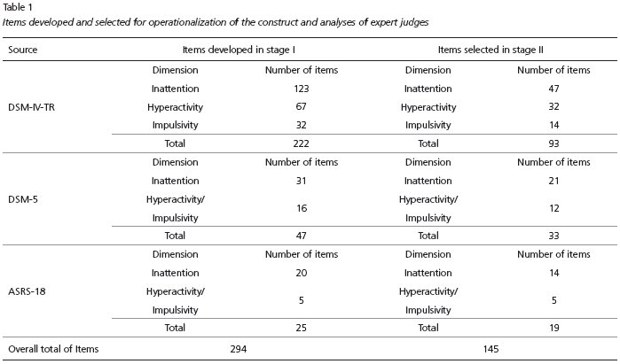 At first, a bank of items was structured in a spreadsheet format, with 294 initial items arranged in the three dimensions (inattention, hyperactivity and impulsivity). It must be pointed out that positive (which indicated the presence of the symptoms) and negative items were developed. Three main sources of information for the development of items were used: the DSM-IV-TR (APA, 2003), DSM-5 (APA, 2013) and the Adult Self-Report Scale for Adults – ASRS-18 (Mattos et al., 2006). Table 1 shows the number of items developed during step two, the selection of items in step three, and the items selected to compose the instrument’s version for administration.