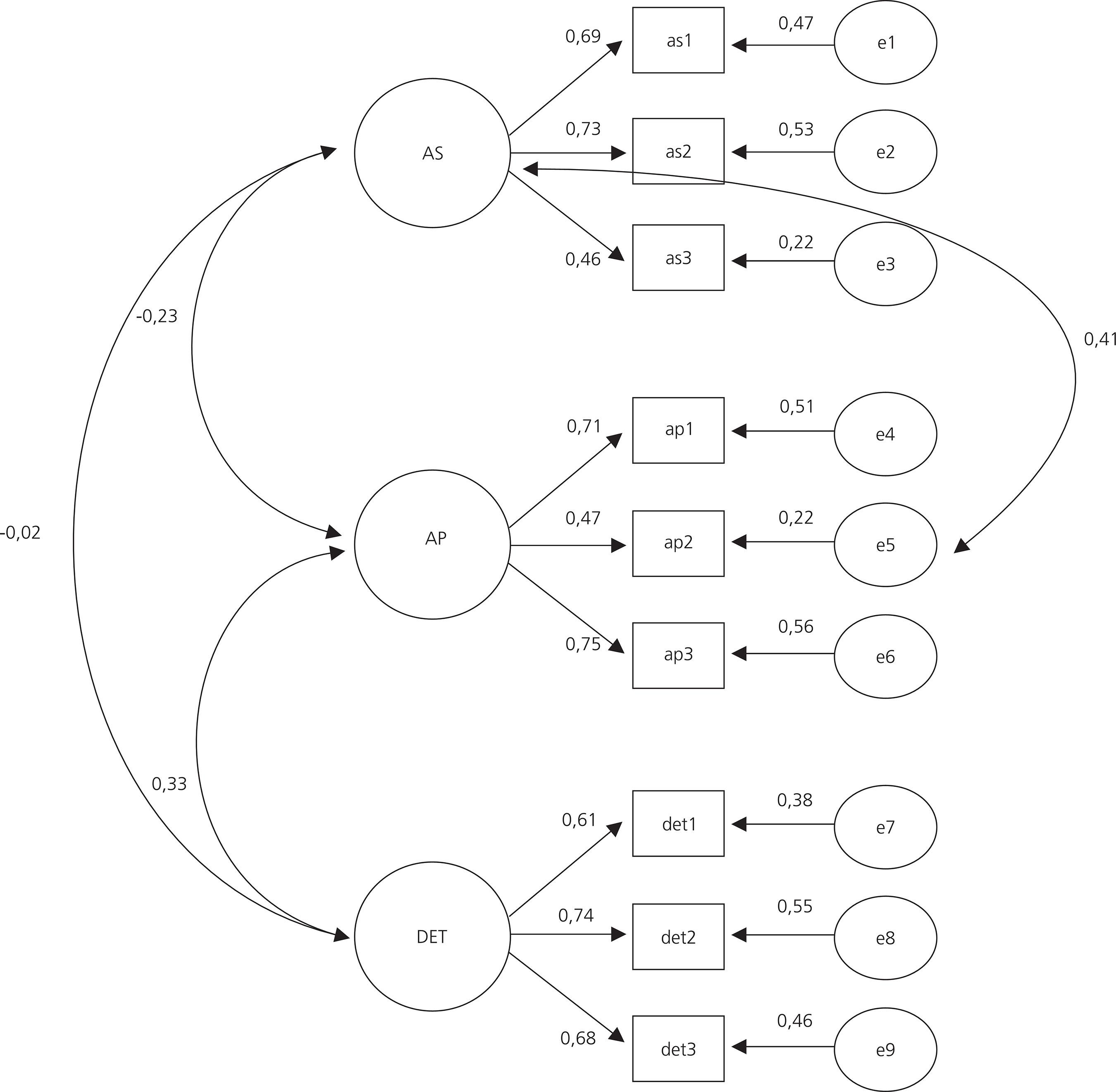 Etapa 3: Análise Fatorial Confirmatória: A solução fatorial obtida a partir da AFE, com nove itens e três dimensões, foi submetida à AFC a fim de testar o ajuste de um modelo de três fatores. A análise foi executada com o programa Analysis of Moment Structures (IBM SPSS AMOS Inc., Chicago, IL, EUA), versão 23.0.