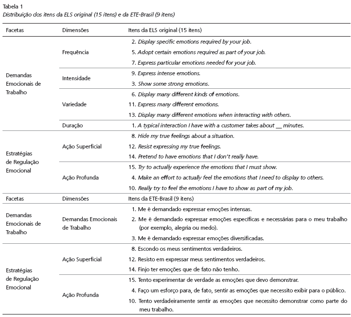 O instrumento final adaptado para a categoria de artista ficou composto, então, com nove itens, distribuídos em três dimensões (demandas emocionais de trabalho, ação superficial e ação profunda). Essa etapa de adaptação pode ser visualizada na Tabela 1, que apresenta a escala original (15 itens) e a escala adaptada ao contexto brasileiro (nove itens).