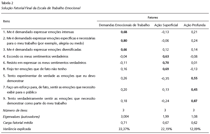 Os três fatores explicaram 67,67% da variância total, sendo que o fator demandas emocionais de trabalho foi responsável pela maior explicação da variância (33,37%), seguido pelos fatores ação superficial (22,19%) e ação profunda (12,09%). A média das cargas fatoriais foi de 0,71 na dimensão demandas emocionais de trabalho; de 0,67 na dimensão ação superficial; e de 0,62 na dimensão ação profunda.