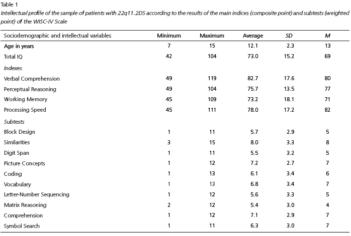Although the main objective of this study was to describe the intellectual performance of a sample of children and adolescents in Brazil with 22q11.2DS based on the WISC-IV Scale indicators, one of the limitations of this study was that it did not consider clinical aspects, such as the presence of psychiatric symptoms and sociodemographic factors, such as family income or educational level, that could contribute to a broader reflection on the observed profile. Since patients have been recruited from high-demand public services, difficulties are often encountered for inter-consultations for psychiatric investigations. Moreover, the sample distribution was not matched by age group, since it is a convenience sample.