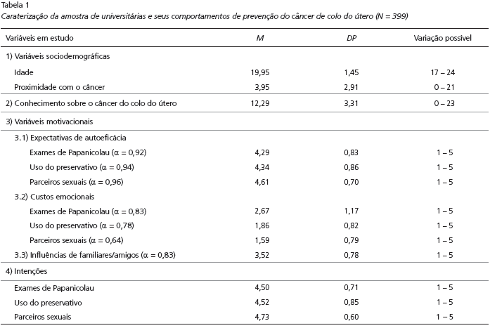 Do ponto de vista motivacional, componente central do Questionário, a expectativa de autoeficácia relativamente a cada um dos comportamentos de prevenção específicos (exames de Papanicolau, uso do preservativo e restrição do número de parceiros sexuais) foi avaliada por seis itens (“Sinto-me capaz de [realizar cada um dos comportamentos de prevenção do câncer do colo do útero]”). Igualmente, os custos emocionais percebidos para cada um desses comportamentos foram avaliados por outros seis itens (“Sinto medo ao pensar em [realizar cada um dos comportamentos de prevenção do câncer do colo do útero]”). Já as influências modeladoras e incentivadoras de familiares e amigos foram avaliadas por quatro itens. Todos os itens foram medidos por uma escala de tipo Likert com cinco pontos, variando de “discordo totalmente” (1) a “concordo totalmente” (5).
