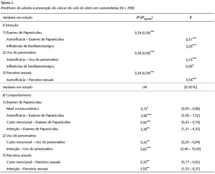 Os resultados dos modelos finais ajustados de intenção para cada um dos comportamentos de prevenção são altamente significativos, destacando-se como preditores a expectativa de autoeficácia de cada comportamento e as influências modeladoras e incentivadoras de familiares e de amigos. Enquanto as expectativas de autoeficácia predizem positivamente a intenção de realizar os três comportamentos de prevenção, as influências de familiares e de amigos predizem positivamente a intenção de realizar os exames de Papanicolau, mas negativamente a intenção de uso do preservativo (Tabela 2).