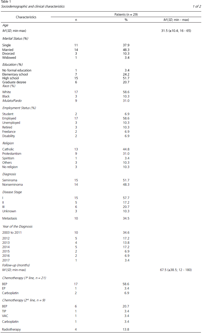 Eligible patients were contacted in the waiting room of the Oncology clinic. Those who were interested in participating signed an Informed Consent Form and were subsequently assessed for distress (Decat et al., 2009), anxiety and depression (Botega et al., 1995), quality of life (Arnold et al., 2000), cognitive impairments (Wagner et al., 2009) and specific needs for testicular cancer (Hoyt et al., 2013). Only instruments widely endorsed and validated for the purpose of this study were included. The application of these instruments was performed in an assisted manner, with the exception of the CAYA-T scale, which was self-answered by patients. In addition, a specific questionnaire was used to identify sociodemographic variables, and clinical information was extracted from each patient’s medical record.
