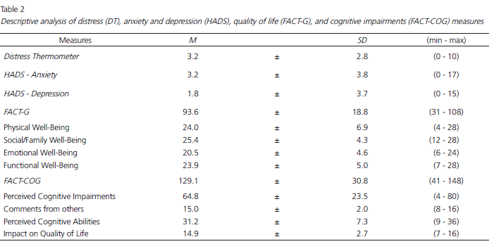To meet the first objective of this study, a descriptive analysis of sociodemographic and clinical variables was performed, using measures of central tendency and dispersion for continuous measures, and frequency for the categorical variables. The same analysis was performed for DT, HADS, FACT-G, FACT-Cog and CAYA-T, with subsequent evaluation of the association between these scales using the Chi-Square Test and the t-test.