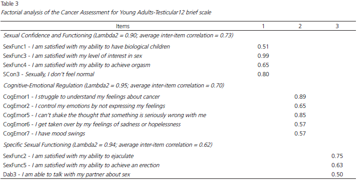 The clinical relevance of this critical finding reinforces the usefulness of a comprehensive assessment to identify specific demands, promoting an opportunity to target and to develop a treatment plan, in order to help patient to better adapt and cope with changes imposed by the treatment and the illness. Therefore, due to the evidence of validation of CAYA-T12, verified in the psychometric analysis, this brief version is endorsed for Brazilian patients diagnosed with testicular cancer. This scale is effective in assessing three domains - Sexual Confidence and Functioning, Cognitive-Emotional Regulation and Specific Sexual Functioning - with the ability to identify other morbidities (e.g., anxiety, depression), or even to discriminate the impact of these needs on patients’ well-being (e.g., quality of life). Based on these findings, it is possible to state the usefulness and validity of the CAYA-T12 brief scale for biopsychosocial assessment of patients’ functionality, being also valuable for the whole care of these patients; a useful and easy scale.