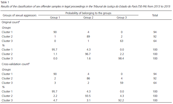 The discriminant function of G1 indicated that 95.7% of the cases sampled were classified correctly. The discriminant function estimated for G2 allowed to classify correctly 96.7% of sex offenders against children/adolescents and the discriminant function of G3 was able to classify correctly 98.4% of sex offenders against children/adolescents, and the remaining 1.6% were allocated to G2. Cross-validation indicated that 94.5% of sex offenders against children/adolescents were classified correctly and showed that the results were close to the original solution, which validates the analysis. The result was that 95.0% of the observations were classified satisfactorily, that is, only six observations were misclassified.