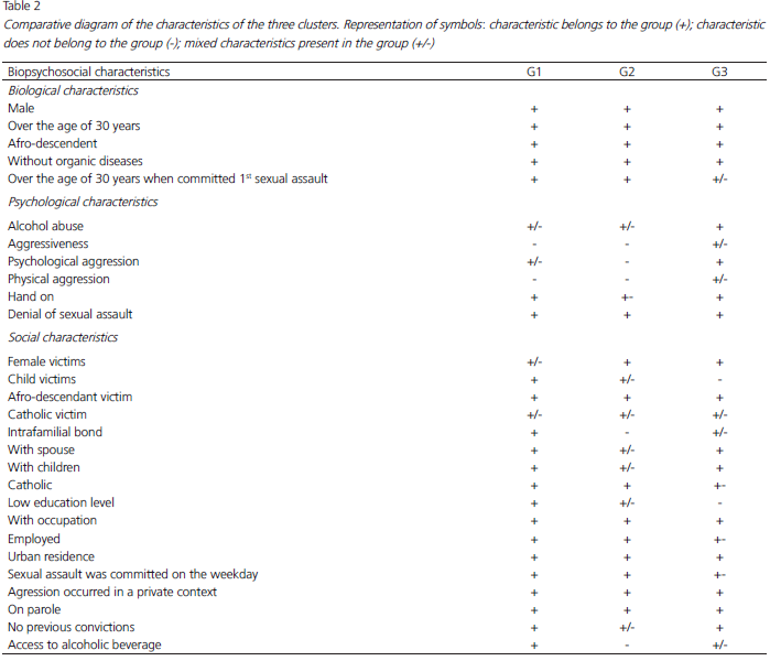 In general, considering only the biological characteristics, the three groups appear to be homogeneous (they present more similarities than differences among them): older Afro-descendant adult men, without psychic and organic diseases. In terms of psychological and social categories, the three groups presented similarities and differences. Thus, the three groups presented typical characteristics: G1 predominantly consisted of older Afro-descendant men, with a low level of education, Catholics, who committed or did not commit psychological aggression during the sexual assault and had preference for children and kinship relationship. G2 consisted of older Afro-descendant men, who did not commit psychological aggression during the sexual assault, had preference for children and adolescents, without kinship and with high and low education level. G3 mainly consisted of older Afro-descendant men, with a high level of education, who committed psychological aggression during the sexual assault and had preference for adolescents.