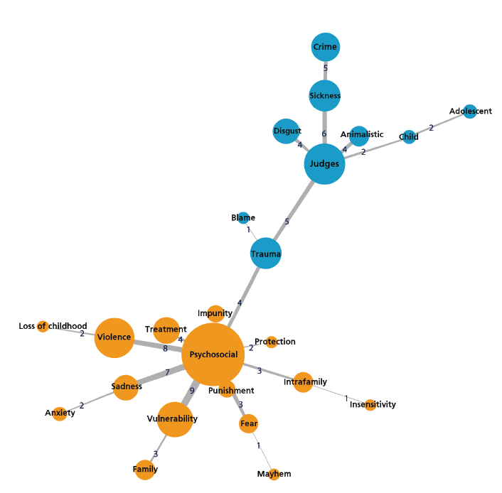The similarity analysis revealed that the word “trauma” was common to both professional groups and was a central element and organizer of the representation. In addition, the terms more closely related to criminality and the pathologization of the abuser such as “disease” (6), “crime” (5), “disgust” (4), and “animalistic” (4) were linked to morality issues.