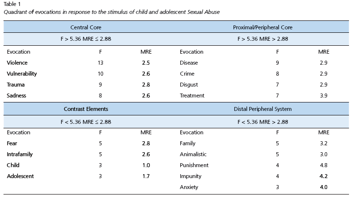 To identify the structure of the social representations of child and adolescent SA, free word association was used with the stimulus phrase “child and adolescent SA” (“abuso sexual infantojuvenil”) to describe the core and peripheral constituents of these representations. First, a database was created using Excel. These data were analyzed using IRAMUTEQ to produce a figure with four quadrants for the given stimulus (Tabela 1) containing the words evoked, their Frequency (F), and the Mean Rank of Evocation (MRE).