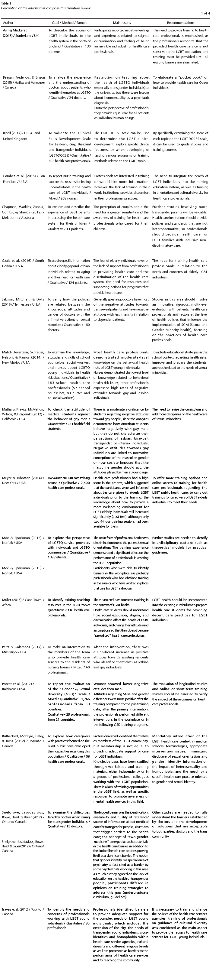 Therefore, the publications seem unanimous about the importance of the qualification of health care professionals to provide a better care for the LGBT+ population, and the concern about the lack of attention to the subject in curricula and in continuing education, however, there is no indication in the literature about which are the competencies to be developed, that is, it does not address training needs analysis, a stage prior to the planning and execution of educational events, pertinent to developing fixes to skills gaps for the appropriate performance of health care practices.