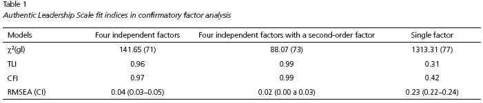 With view at investigating the internal structure of the scale, the Confirmatory Factor Analysis (CFA) procedures were adopted to test the degree of adjustment of the Authentic Leadership Inventory theoretical model to the empirical data collected. Three different models were tested: (i) four independent factors; (ii) four independent factors with a second order factor, and (iii) single factor model. The comparison of the fit indexes of adjustment obtained in each of the models showed that the four first-order factors with a second-order factor model was the one that presented the best fit indexes (c2= 88.07, p < 0.001; c2/gl = 73; TLI = 0.99, CFI = 0.99; RMSEA = 0.02) (Table 1).