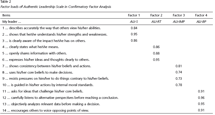 This initial version was submitted for review to 40 undergraduate students and 32 Master Business Administration (MBA) students who answered the scale items. The subsequent analyses showed that items 1 (self-knowledge) and 6 (relational transparency) should be withdrawn from the instrument, because they have high loads in more than one factor. This process led to the maintenance of 14 items in the initial version of the scale (Neider & Schriesheim, 2011).