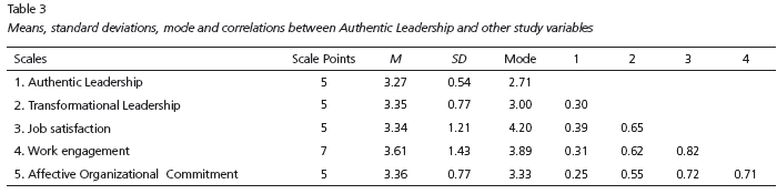 Table 3 presents the means, standard deviations, mode and correlations between the different scales adopted in the study. As predicted, authentic leadership presented a moderate positive correlation with the transformational leadership scale (r = 0.39, p < 0.001), which confirmed hypothesis 1. Also as expected, authentic leadership presented a moderate positive correlation with the job satisfaction scale (r = 0.30, p < 0.001) and with the scale of work engagement (r = 0.31, p < 0.001), thus confirming hypotheses 2 and 3, respectively. Finally, authentic leadership presented a low positive correlation with the measure of affective organizational commitment (r = 0.25, p < 0.001), which prevented confirmation of hypothesis 4.