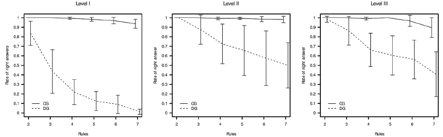 In the picture naming task, DG presented below-average performance compared with CG (F [1; 45] = 13.19, p = 0.001, η2p = 0.23). In all RAN tasks, the children in the DG presented a higher mean reaction time than those in the CG. In the RAN picture naming task, there was a significant difference between the groups (F [1; 45] = 30.08; p < 0.001; η2p = 0.40). In the RAN letter task, a significant difference was also observed (F [1; 45] = 34.25; p < 0.001; η2p = 0.43). In the RAN color task, the results showed a significant effect (F [1; 45] = 19.89; p < 0.001; η2p = 0.30). The RAN number task revealed a difference between groups (F [1; 45] = 19.09; p < 0.001; η2p = 0.30). All tasks presented high magnitude of effects. To analyze the influence of syntactic complexity of dictated numbers on the performance of children, repeated-measures ANCOVA was used, adopting the numerical complexity as an intra-subject factor (2 to 7 transcoding rules), the group as a between-subject factor (CG and DG) and the school level (levels I, II or III). Since the school level factor correlates with age, only intelligence was included as a covariate. As the transcoding task has a different number of items in each level of syntactic complexity, the dependent variable of the analysis was the proportion of correct answers in each of these levels.