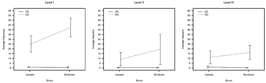 This analysis revealed a significant effect for error type (F [1; 42] = 12,34; p < 0,01; η2p = 0,23), which indicated a higher frequency of syntactic errors; a group effect (F [1; 42] = 44.83, p < 0.001; η2p = 0.52), which indicated a significantly higher frequency of errors observed in the DG, and a significant school level effect (F [2; 42] = 8, 77, p < 0.01, = 0.29). In the last effect, a contrast analysis indicated a significant difference between the first and second levels of schooling (p < 0.001), but not between the second and third levels (p = 0.99). A significant interaction between type of error and group (F [1; 42] = 5.80; p < 0.05; η2p = 0.12) was observed, indicating that the effect of the type of error was different between the groups. Post-hoc tests with Bonferroni correction showed that in the CG there is a similar frequency of lexical and syntactic errors (t = 1.36, p = 0.19), while in the DG the frequency of syntactic errors is significantly higher than frequency of lexical errors (t = 3.96, p = 0.001). No other interactions reached statistical significance. (Figure 2)