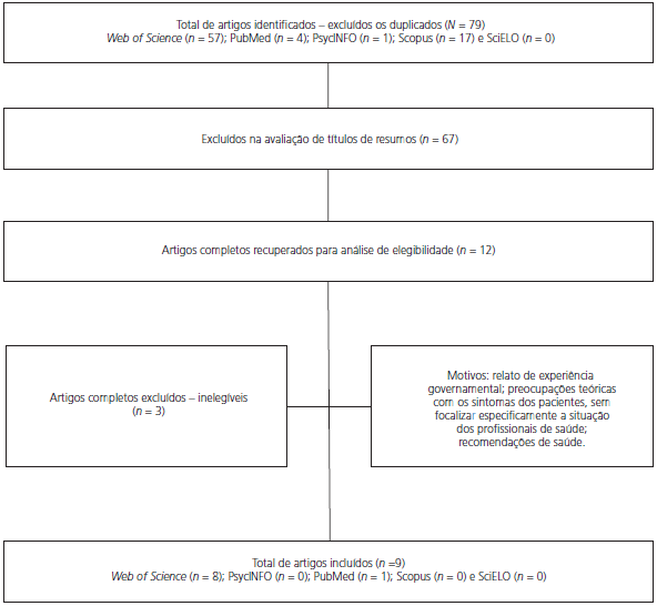 Foram identificados 79 artigos nas bases consultadas, já excluídos os duplicados (57 na Web of Science, quatro na PubMed, um na PsycINFO, 17 na Scopus e nenhuma ocorrência na SciELO). Concluído o primeiro nível de análise da elegibilidade (a partir da prévia leitura de todos os títulos, resumos ou abstracts ), aplicando-se os critérios de inclusão e exclusão preestabelecidos, selecionaram-se doze publicações. Após o refinamento final da busca, o corpus da revisão ficou constituído por nove artigos, publicados entre os anos de 2003 e 2020.