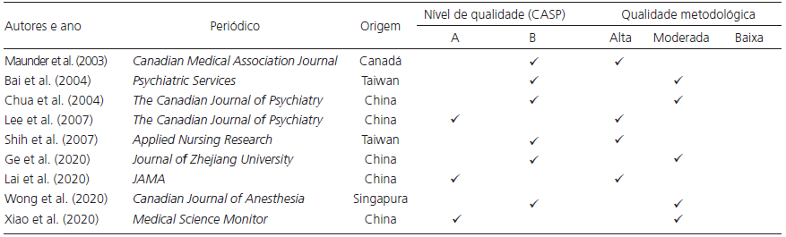 O processo de construção do corpus revisado seguiu o protocolo Preferred Reporting Items for Systematic Reviews and Meta-Analyses (PRISMA) e se encontra sumarizado na Figura 1. Os artigos selecionados foram publicados em inglês em uma variedade de periódicos internacionais: JAMA (Journal of the American Medical Association), Psychiatric Services, The Canadian Journal of Psychiatry, Journal of Zhejiang University, Canadian Medical Association Journal, Applied Nursing Research, Medical Science Monitor e Canadian Journal of Anesthesia. Quanto ao país de origem da publicação, cinco estudos eram provenientes da China (Chua et al., 2004; Ge, Yang, Xia, Fu, & Zhang, 2020; Lai et al., 2020; Lee et al., 2007; Xiao, Zhang, Kong, Li, & Yang, 2020), dois de Taiwan (Bai et al., 2004; Shih et al., 2007), um do Canadá (Maunder et al., 2003) e outro de Singapura (Wong et al., 2020). Em relação ao delineamento metodológico, sete pesquisas eram quantitativas, uma qualitativa e uma de natureza teórica.