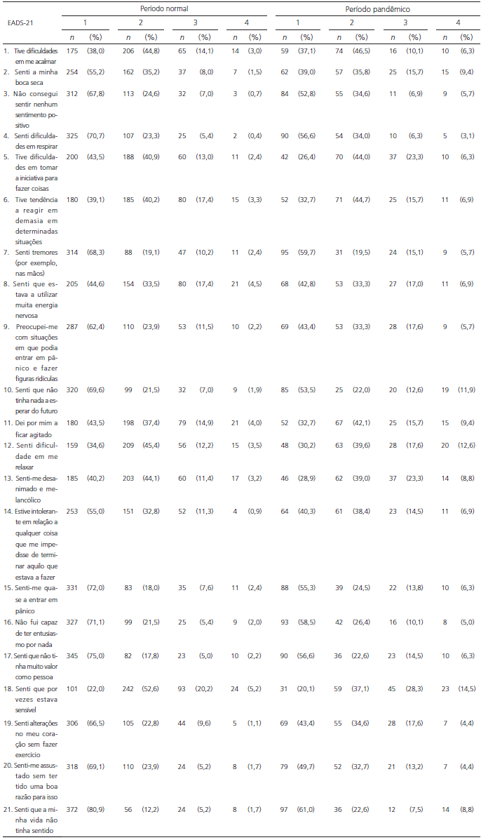 A análise das respostas aos itens da EADS-21 (Tabela 1) permite perceber que no período pandêmico há itens cuja pontuação, relativamente às três subescalas – depressão, ansiedade e estresse – é substancialmente mais elevada do que a obtida no período normal (e.g., itens 2, 5, 10, 13, 15, 18, 19, 20 e 21).