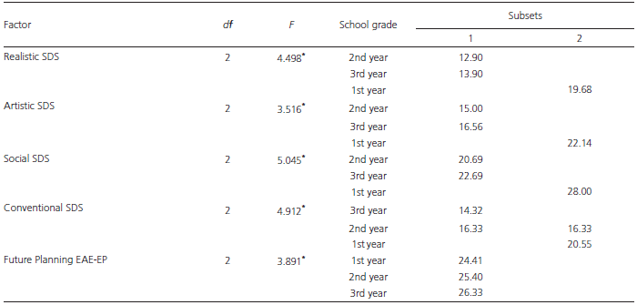 Regarding self-efficacy beliefs, the gender variable generated a significant difference only in the Occupational Information Collection factor, in which women exhibited higher means when compared to men (t(531) = 2.889, p< 0.001). In the comparison by type of school, students from private schools differed from students from public schools with higher scores in all the domains assessed by EAE-EP: Self-assessment (t(145) = -2.175, p< 0.05), Collection of Occupational Information (t(610) = -2.768, p< 0.05), Search for Practical Professional Information (t(610) = -2.531, p< 0.05), Future Planning (t (609) = -3.966, p< 0.001) and General Score (t(609) = -3.197, p< 0.05). When considering age, only in the Factor Searching for Professional Information Practices significant differences were found, in which participants over 16 years of age obtained higher mean in relation to younger participants (t(455) = -2.047, p< 0.05). In all the differences found, the effect size was small with Cohen’s d ranging between 0.10 and 0.40. Then, we sought to verify possible differences in the types of interests assessed by the SDS and in the EAE-EP factors according to the school grade using ANOVA and Tukey’s post hoc test. In the SDS, only the Investigative and Entrepreneur types did not show significant results, while in EAE-EP, no statistically significant results were found in three of the four factors evaluated, in addition to the general score (Table 1).
