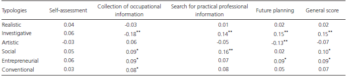 The correlations obtained were mostly null or without statistical significance. Among those statistically significant, the Investigative type showed correlations with the three factors and with the EAE-EP General Score, and the correlations were positive between the type and the factors Occupational Information Search, Future Planning and General Score and negative with the Occupational Information Collection factor, but with small magnitude in all coefficients. This data suggests that the more the person has investigative interests, the more he or she tends to have beliefs in his/her ability to get in touch with professionals in his/her preferred area, plan his/her future and, in general, has a higher level of self-efficacy for the professional choice. Subsequently, partial correlations were performed controlling the variables gender, type of school and school grade; however, the results did not show significant changes.