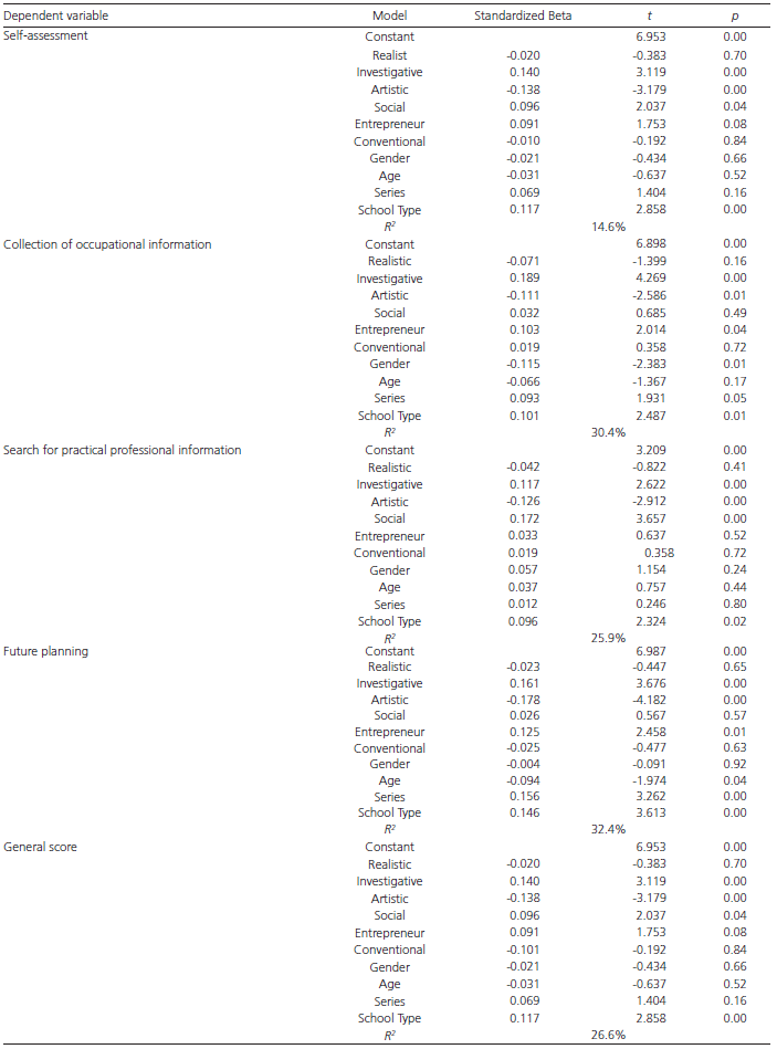 The results indicated that in the self-assessment factor the determination coefficient (adjusted R2) explained 14.6% of the variability F(10) = 1.248; p = 0.25, and the types Investigative, Artistic, Social and the type of school obtained statistical significance in the prediction of the variable (p < 0.05). In the Occupational Information Collection factor, the adjusted R2 value indicates the prediction of 30.4% of the variance (F(10) = 5.811; p = 0 .000), in which investigative and artistic interests, as well as gender, were statistically significant in the prediction. In turn, the Search Factor for Practical Professional Information (R2 = 25.9%; F(10) = 4.166, p = 0.000) was predicted by artistic and social investigative interests and by the type of school. Regarding Future Planning, the determination coefficient explained 32.4% of the variability (F(10) = 6.683; p = 0.000) with the investigative, artistic and entrepreneurial types and the variables age, gender and type of school contributing in a statistically significant way in predicting the variable. Finally, in relation to the General Score, the adjusted R2 indicated the prediction of 26.6% of the variance (F(10) = 4.341; p = 0.000), and again the artistic typology was the only one that was significant in the prediction of beliefs of self-efficacy for the professional choice.