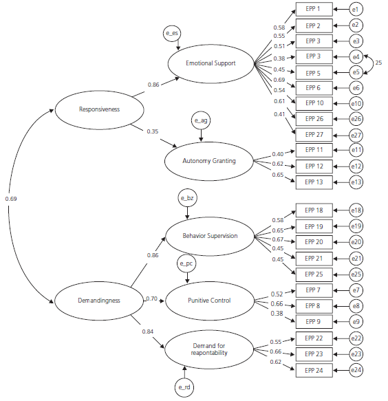 Facing such low indexes regarding internal consistencies on punitive control and autonomy granting factors, a second-order CFA was performed using the same theoretical proposition that gave birth to the EPP in 2006. This way, punitive control, behavioral supervision, and demand for responsibility were grouped in a latent dimension called demandingness; emotional support, and autonomy granting were grouped in a latent dimension called responsiveness; and intrusiveness remained as an independent dimension (Teixeira et al., 2006). Although more satisfactory alphas were obtained: α = 0.77 for demandingness and α = 0.75 for responsiveness, the model fit deteriorated considerably: χ2/df = 1.85, CFI = 0.88, GFI = 0.91, RMSEA = 0.043, SRMR = 0.065.
