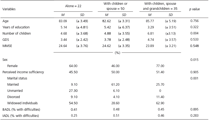 Of the 107 advanced elderly individuals selected, 22 of them lived alone, 50 in uni- or bi-generational households, and 35 in tri-generational households. The analyzes indicated that there was a higher prevalence of women, widowed individuals, and a higher number of children for elderly individuals living in tri-generational arrangements. Elderly individuals living in uni- or bi-generational environments were mostly males (54%) and married. For elderly individuals who reported living alone, there was a higher prevalence of widowed individuals, followed by unmarried individuals. No statistically significant associations were found between the household arrangement, age, education, mood, mean MSME score, and the individual presenting any BADL and IADL difficulties (Table 1).