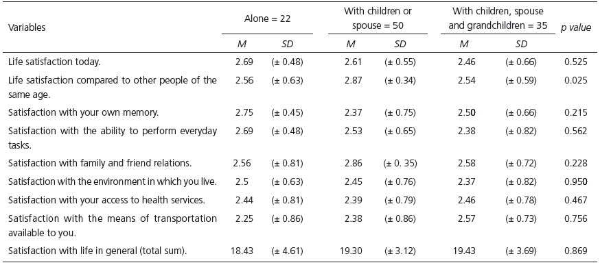 Life satisfaction was evaluated through a questionnaire containing an item about satisfaction with life as a whole, an item about satisfaction comparing the other individuals of the same age, six items about satisfaction, relating to memory domains; functional and problem-solving capacity, friends and family relations, environment, access to health services and means of transportation (Neri, 2002). Each item was composed of a scale from 0 to 3 points, whose sum ranged from 1 to 24. In this study each item was investigated separately (mean score of 0 to 3 points) and also their sum. Older people who scored < 21 were considered to have less satisfaction with life and those who scored > 22 were considered as individuals with greater life satisfaction.
