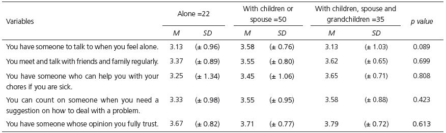 Although other studies have related social support to the household arrangement (Alves et al., 2015; Borges & Magalhães, 2011; Paúl, 2005; Rabelo & Neri, 2015; Rosa et al., 2007) in this study there were no statistically significant associations between these variables. It was observed that the sample tended to have a high availability of self-perceived social, instrumental, affective, informative and social-emotional support. However, the tendency of the group with a uni- or bi-generational arrangement to have a greater availability of social-emotional support when compared to the others, may indicate that, in this aspect, the coexistence with the next generations favors these exchanges, performed by people who share common beliefs, stories and values.