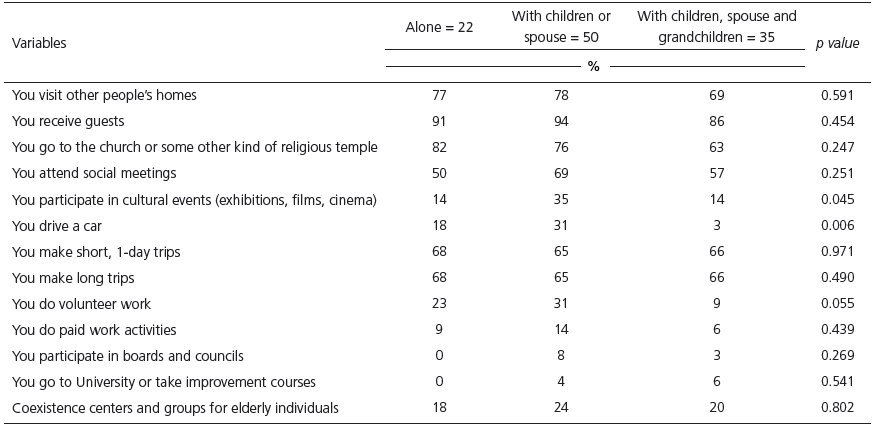 The results of this study indicate that the household arrangements for advanced elderly individuals are associated with the family composition, variables of life satisfaction and social involvement. It was observed that elderly individuals with tri-generational arrangements were female, widowed and with a larger number of children. The engagement in these activities may be related to motivational and relational factors, since participation in social activities may increase the perception of the elderly individual’s quality of life (Borges & Magalhães, 2011; Mantovani, Lucca, & Neri, 2016; Cachioni et al., 2017).
