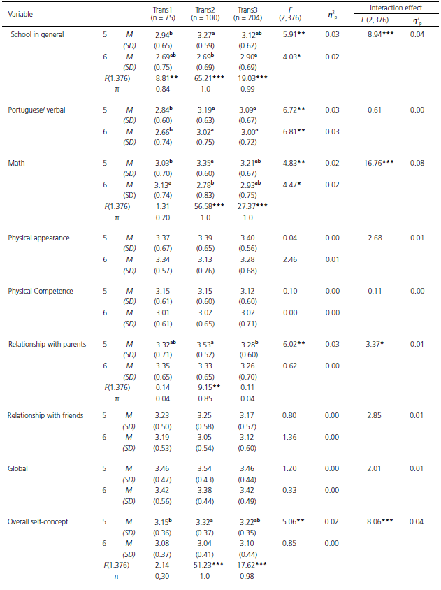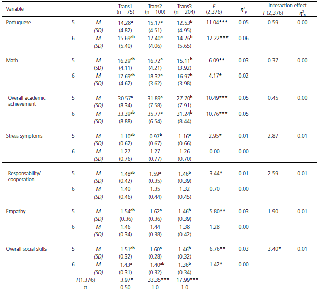In this section, only results with statistical significance are commented. The tables show results of comparisons between the three transition groups in the 5th and 6th grades, variations between the two moments, and the interaction effects between time and type of transition. The specification of the differences between groups is shown in the tables. The specification of variations between the moments as well as interaction effects are pointed out in the text.