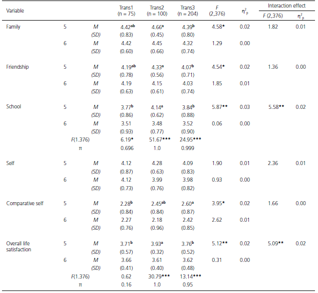 Table 3 shows the results regarding the life satisfaction factors. In the 5th grade, significant differences were observed in family, friendship, school, comparative self and total life satisfaction with a small effect size. Except for satisfaction with the comparative self, in which Trans3 presented a higher mean value than Trans1, the Trans2 group presented a higher mean value either compared to Trans3 (friendship, family) to Trans1 (school), or to both (total). In the 6th grade no significant differences were observed.