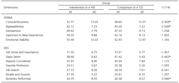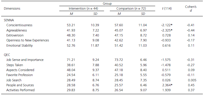 The results show that before the intervention, the groups differed; the students of the Comparison Group were more responsible with regard to their duties, more organized, collaborative and empathic than those of the Intervention Group. The Comparison Group also stood out with regard to the higher level of planning for making school and professional choices, suggesting that the Comparison Group students had already thought, for example, about ways to obtain information on the greatest number of professions, on the functions of the profession that is of interest to them, their interests, abilities and qualities. On the other hand, the students of the Intervention Group stand out regarding the activities performed, suggesting that the students in this group had already received some help or information about initiatives, including meetings with employers, vocational/career activities parallel to school activities, visits to universities and companies, besides the observation of people in their work setting. This suggests that while Comparison Group students are more focused on the planning sphere, Intervention Group students are more focused on actual action. Table 2 exhibits the results of the comparison of socioemotional and career competences between the Intervention Group and the Comparison Group after the intervention.