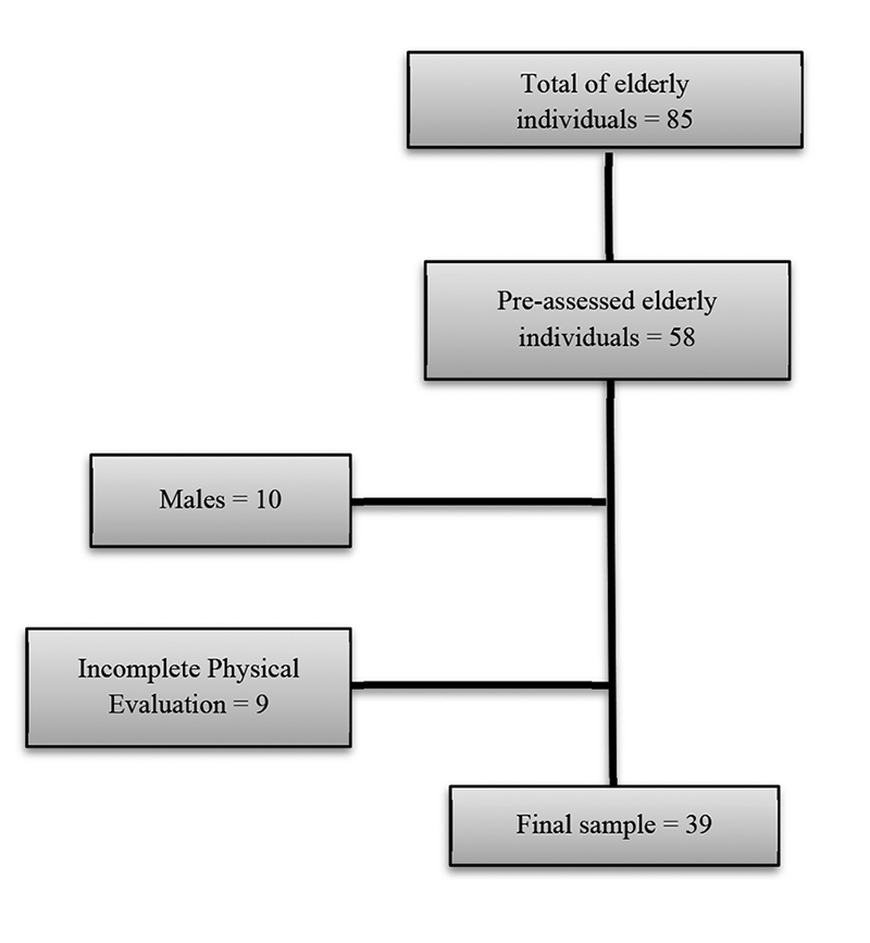 The sample of the present study comes from a population of 85 elderly individuals participating in a cognitive training program of the Universidade Católica de Brasília (UCB, Catholic University of Brasilia) offered to elderly individuals of the Federal District, Brasília, Brazil. From the total number of participants, 58 of them were evaluated. However, in the present study, in order to homogenize the sample and compare the elderly in the physical performance measures, male participants (n = 10) and those with an incomplete physical assessment (n = 9) were excluded from the analysis, excluding 19 participants. Therefore, the analyzed sample refers to 39 elderly women with and without cognitive decline in the Mini Mental State Examination (with the cutoff points according to the educational level used by the FIBRA Network (Neri et al., 2013), with a mean age of 67.77 ± 6.34 years (60-87). Of these participants, 37 completed the interventions and had a frequency equal to or greater than 75% in the proposed sessions, which is the sample investigated, as shown in Figure 1.