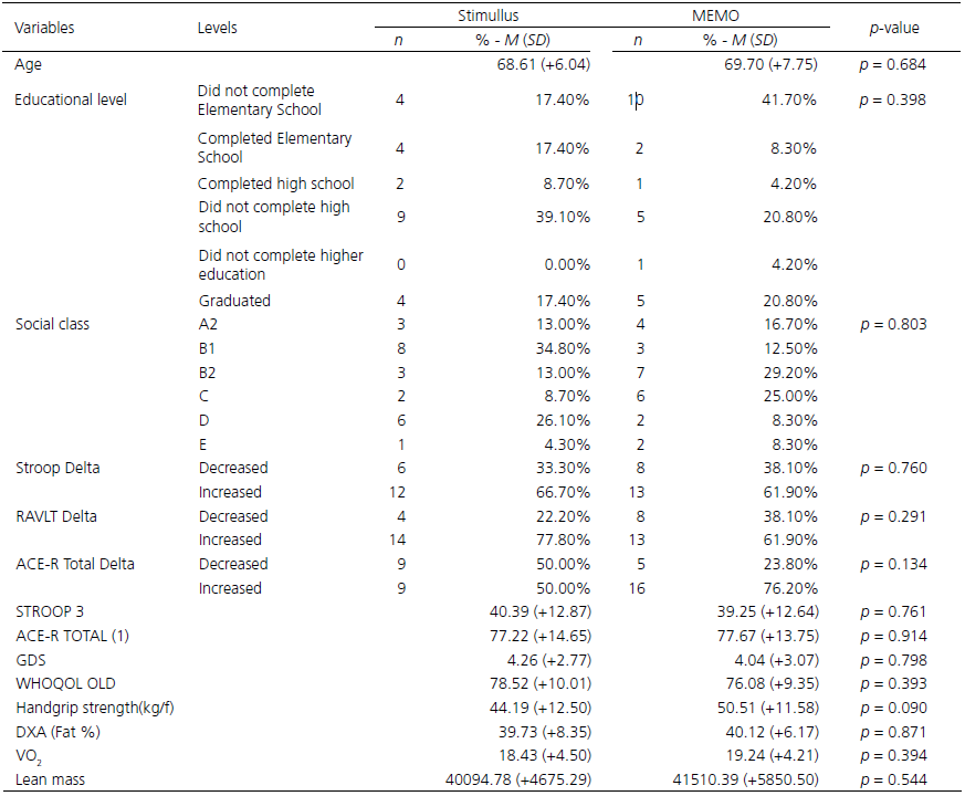 At the end of the assessments, in the sixth stage, the elderly individuals were distributed in the cognitive stimulation (Stimullus) and memory training (MEMO) groups according to the individual’s age, sex and educational level, so that the participants could be compared. In this study, male participants were removed from the test for a better description and for a homogenization of the sample, because there are variables in physical fitness measures between men and women that would require analyzes stratified by sex. As the sample size of men was reduced (n = 10), the researchers chose not to analyze the data of elderly men in the present study. These two interventions refer to studies of refinement and adaptations of these techniques developed by Chariglione and Janczura (2013), and Gilbert, Fontaine and Belleville (2011), the latter being translated and adapted to the Portuguese language in 2014 (Chariglione et al., 2018b).