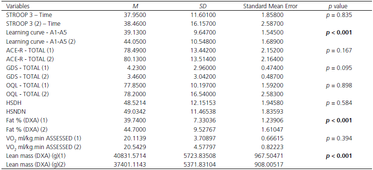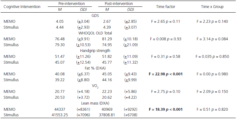As shown in Table 1, the Stimullus and MEMO groups were similar in the sociodemographic, cognitive, mood, and physical fitness variables. Table 2 presents the general effects of cognitive interventions, regardless of group (Stimullus or MEMO). Of the variables analyzed, only the performance in the RAVLT word list (Learning Curve) had a statistically significant increase in the posttest. Regarding the variables of interest, the sample of elderly women tended to reduce depressive symptoms and, at the end of the intervention, showed an increase in their fat mass and a decrease in their lean mass levels.