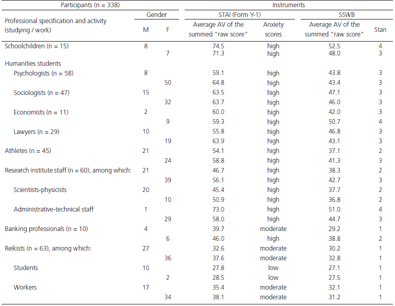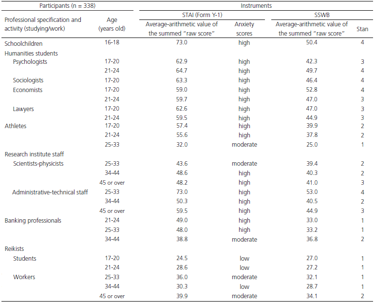 According to the analysis of the influence of the gender factor, presented in Table 2, the differences in the average-arithmetic values of STAI indicators in each group varied between 0.2-9.4, with the smallest differences found in sociologists, and the highest in research institute staff. Differences in the average-arithmetic values for SSWB indicators ranged from 0.4 to 9.6, with the smallest differences found in psychologists, and the highest in banking professionals. Groups of male senior pupils, and females of the Reikist group, athletes, research institute and banking professionals had the worst results both in the STAI and SSWB, compared with those of the opposite sex. The other groups did not show such a coincidence, namely: according to the STAI indicators, male participants had worse results than female participants had, while the reverse trend was observed in the SSWB indicators.