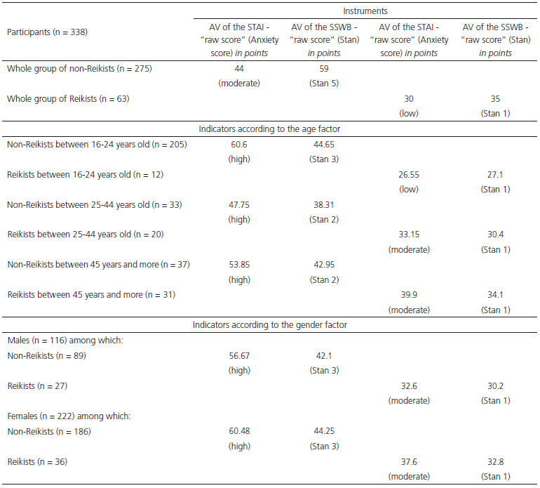 Table 3 presents the summarized indicators regarding the STAI and SSWB scores of the non-Reikist and Reikist groups which reveal that the results of the Reikist group are significantly better as to the degree of anxiety and the level of subjective emotional well-being. These results were discriminated in generalized indicators for each of these two groups and according to the age and gender factors.