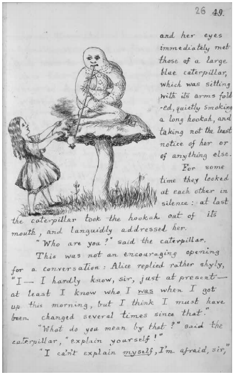 Hasta la fecha el manuscrito completo de Carroll redactado a mano del original, incluyendo sus ilustraciones, puede consultarse en línea por medio de la Biblioteca Británica3 :