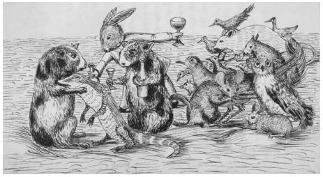 Un mayor número de las imágenes de Carroll representan más a Alicia que a las criaturas que sir John Tenniel crearía en colaboración con Carroll, pero varias representan también colectivos multiespecies. Los muchos grupos de animales y objetos animados reunidos en actos de la corte, como ejércitos, y otros elementos de ese tipo, son por un lado totalmente originales a sus obras, mientras que también reflejan los intereses de los autores románticos en la comunicación y comunión de esas interespecies. Considérese el ulular del chico de Wordsworth a los búhos en Winander, por ejemplo, en el poema «había una vez un chico». Pero sin duda, el trabajo reciente sobre los animales y la ecología revisita algunos de estos primeros imaginarios éticos y sociales formalizando el equipamiento teórico que articula este impulso. Mucho del trabajo de los estudios animales en los últimos treinta años explora nuevas formas de, como lo dijo alguna vez Peter Singer, «ampliar el círculo» de consideración ética (Singer, 1981). Trabajos recientes de académicos como Eduardo Kohn (How Forests Think, 2013) y Timothy Morton (Being Ecological, 2018) demuestran la coexistencia de múltiples especies en formas similares a lo que Matthew Calarco ha explicado recientemente en Thinking Through Animals: Identity Difference Indistinction (2016) como «indiferenciación», que busca deshacer el legado humano de la racionalidad como autoridad categórica, y dominación de los otros a través de ella, afirmando o empleando conceptos de diferencia humano-no humano aun en una declaración inicial de otredad. En cierto sentido, la continuación que hace Carroll del género animal didáctico ya tiene el «poder de fuego» mental para imaginar una comunidad interespecie. El género fantástico, después de los cuentos de hadas y las fábulas –lo fabuloso simplemente– imagina esos mundos como su canon central. Es ahí donde ayuda mucho la frustración de Tenniel por la representación icónica, pues la representación indexical intenta dejar que las criaturas sean de formas distintas al imaginario humano. La tensión clave es que ese estilo de representación es aprovechada por lo colonial, que recoge taxonomías de la historia natural del siglo XIX. Pero si actualmente la fotografía o la captura digital del animal «real» puede motivar el interés general, la tecnología de Tenniel de lo no humano también logra hacerlo.